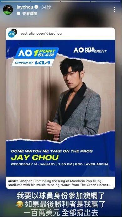 周董这次参加的是澳网期间的特别娱乐赛事One Point Slam(“一球制胜”)。
